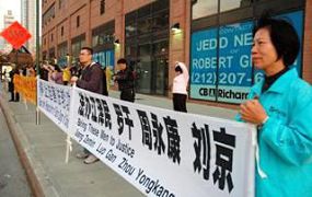 ![]() 在纽约中领馆前,和平抗议中共迫害 |