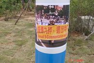 2006年4月26日凌晨5点左右,吉林抚松县某镇通往火车站的跨河大桥上展开了一个约15米的巨大条幅,白底黑字的写着“退党一千万 敲响共产邪党的丧钟”。