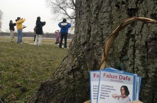 法轮功学员在公园炼功,树边放着供路人索取的介绍材料