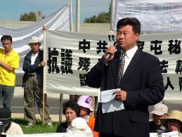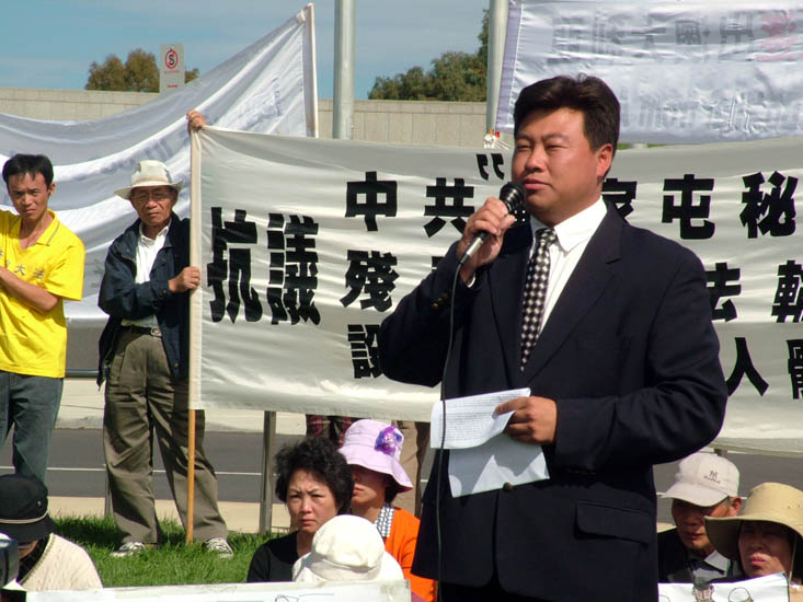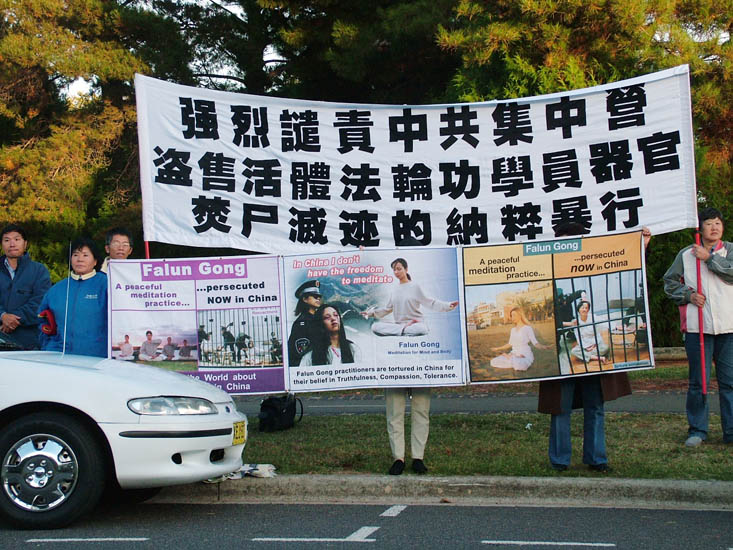 【明慧网2006年4月5日】在中国总理温家宝访问澳洲之际,法轮功学员2006年4月3日下午在澳洲国会山庄前举行新闻发布会,呼吁制止迫害法轮功,要求法办江泽民、罗干、刘京、周永康,并立刻调查苏家屯及其它集中营对大量法轮功学员進行活体摘除器官并焚尸灭迹的惨案,同时向媒体宣布法轮功学员潘宇以酷刑罪将随同温家宝访澳的中共商务部长薄熙来告上法院,并已经成功递交了诉状。