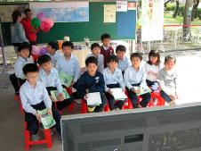 小朋友专注的观看营救受迫害法轮功儿童的录像片
