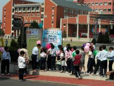 小朋友看完展览后手里拿着“法轮大法好”的气球还有一朵朵精美的小莲花,排队一起签名声援反迫害,要走时还一起大声喊着“法轮大法好!真善忍好!”路过的同学都会停下脚步观看。