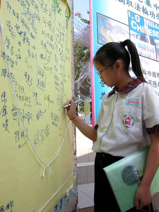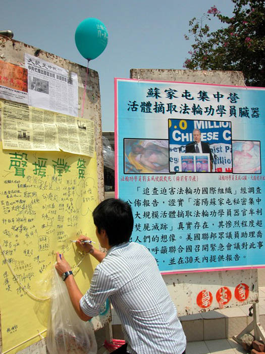 除了让更多同学及民众知道法轮大法的真相,一起来关注发生在中国的这场迫害,举办者还希望利用这次展出机会,让大家了解到最近曝光的中国沈阳苏家屯设有法轮功死亡集中营,大量强摘活体器官供移植出售的消息。在会场并设有征签声援反虐杀的看板,让大家认清中共的残酷迫害手段已到了丧心病狂、人神共愤、令人难以置信的地步了,透过声援征签的方式让每一个有良知的人出来制止,不允许中共无法无天、无视人权的犯罪。