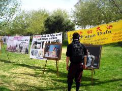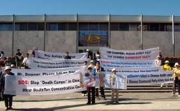 就在霍华德先生与温家宝签署了一项铀出口贸易协定的一小时之后,法轮功学员聚集在联邦议会大厦外,手举横幅和图片展板,要求中共立即拆除集中营。