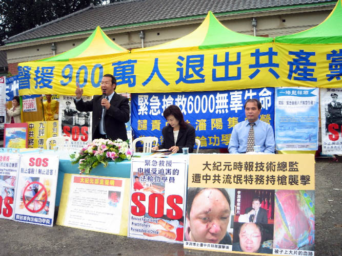 ![]() 法轮大法信息中心发言人李维(左二)谴责中共迫害 |