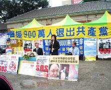 【明慧网2006年4月6日】中共秘设苏家屯集中营、活体摘除法轮功学员器官的血腥暴行被揭发后,全球各地的谴责之声高涨。2006年3月26日,“全球告别中共大联盟”也在台湾云林县虎尾镇发起了一场声援九百万退党暨反中共迫害大游行,民众踊跃参与,云林县县长苏治芬及立法委员林树山亦到场声援支持。