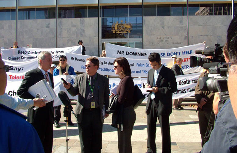 【明慧网2006年4月6日】2006年4月3日上午,法轮功学员在澳洲首府堪培拉高等法院前举行了新闻发布会,向媒体披露了法轮功学员起诉外长唐纳一案的突破性进展。据悉,澳洲外长唐纳因无法向法庭提交其使用外长权力的相关依据,不得不停止签发限制法轮功学员在中使馆前使用抗议横幅的行政令,并愿意支付法轮功方面的法律诉讼费。