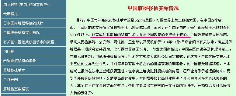 针对“中国脏器移植实际情况”的说明就很点题,“目前,中国每年完成的移植手术数量仅次于美国,可谓世界上第二移植大国。在中国29个省、市、自治区的官立医院仅肾移植手术已经完成3万5千余例,在全国范围内,每年肾移植手术例数多达5000件以上。能完成如此数量的移植手术,是与中国政府的支持分不开的。中国政府最高人民法院、最高人民检察院、公安部、司法部、卫生部以及民政部于1984年10月9日联合颁布有关法律,确立提供脏器是一项政府支持行为。这可谓世界绝无仅有。……”(见上图1)