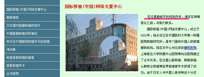 设立在沈阳的中国医科大学第一附属医院的国际移植(中国)网络支援中心,网址是www.zoukiishoku.com,中文网页被删。