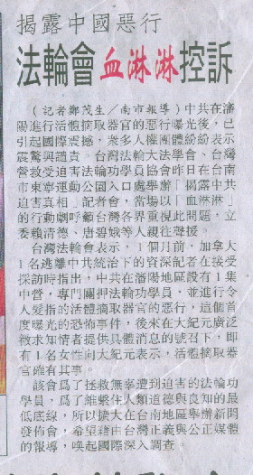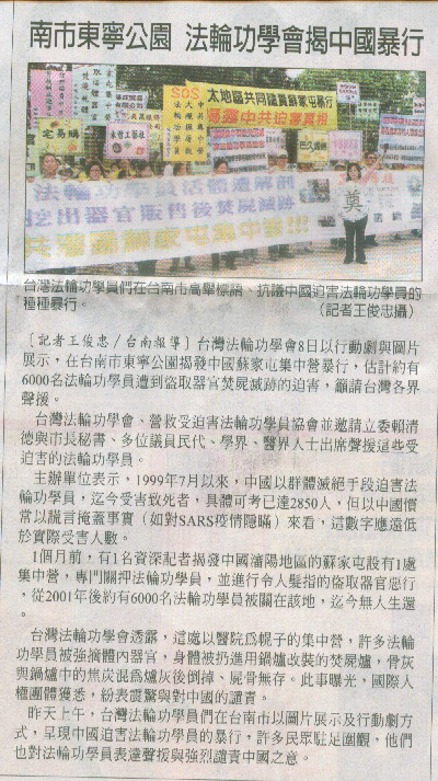 【明慧网2006年4月9日】为了揭露并谴责中共建立了至少36个类似沈阳苏家屯的集中营,摘卖法轮功学员活体器官,牟取暴利、焚尸灭迹的兽行,由香港、马来西亚、台湾、新加坡、日本、印尼、韩国、泰国、澳门等九个国家地区发起的“亚太地区共同谴责苏家屯暴行、揭露中共迫害真相记者会”,2006年4月8日在台湾台南市隆重召开。