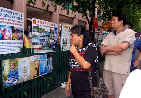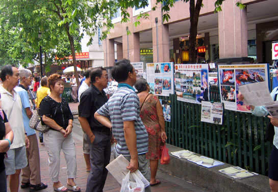 【明慧网2006年5月1日】2006年4月28、29日两天,法轮功学员连续在新加坡闹市区四马路观音庙,展示真相图片,揭露中共持续7年对法轮功学员的残酷,并声援一千万中国人退出中共及其相关组织。