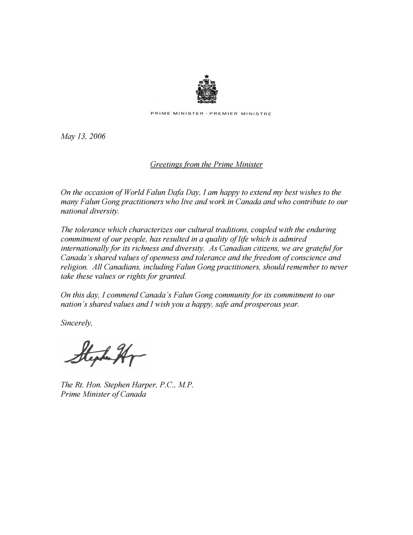 以下是加拿大总理斯蒂文•哈珀的贺信: