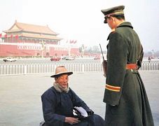 一位50多岁的老人在天安门广场席地打坐,警察来抓他,他说:“先别抓我,让我把话先说完。”他从随身携带的包里拿出9双鞋,一一摆到地上,“我从四川用了两个月时间,穿破了9双鞋才走到北京,就为来说一句法轮大法好,法轮大法是正法;政府错了。”