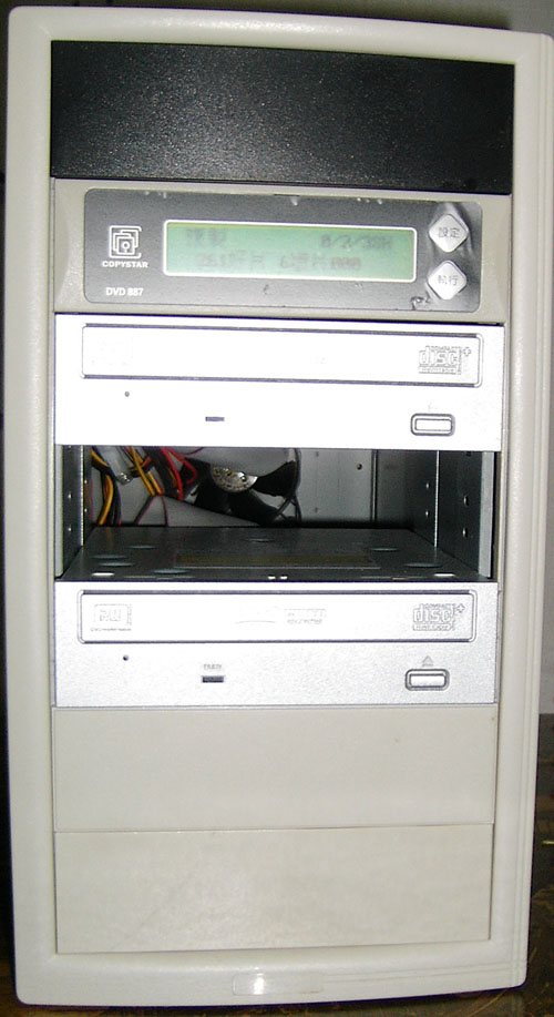 我的电脑是笔记本,刻录不方便,所以我就索性也买了一台这个机器。这种机器是专门来刻碟的,不需要用电脑,是独立工作的。只要有母碟就可以刻录了。由于它有自带机箱,所以电源非常稳定,刻录功能很强,普通刻录机刻不了的它都能刻。它的大小和形状包括原理都和电脑机箱是差不多的。它分为几个部份,机头(也有叫拖机的),刻录机,硬盘(可选可不选,看自己的意思)。机头的价格DVD在一千二、三百左右,也有VCD机头,但是更普及的是DVD,现在VCD机头都已经不怎么生产了。我的刻录机我给它的名字叫起起,商家给它的名字叫copystar,我之所以买这个牌子是因为当时看到刻碟的那个柜台用的就是这个牌子,业主讲他用了两年多了,还是很好。他们刻录的量是很大的。