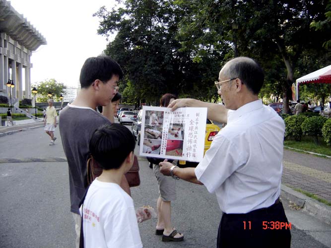 2004年9月,高雄文化中心举办“反迫害真人模拟演示酷刑展”,揭露并呼吁制止江氏集团在中国大陆对法轮功学员进行的残酷迫害。同年10月在“城市光廊”艺术广场再次举办反酷刑展,演示揭露酷刑行动剧,中共残酷的迫害手段震惊了在场的每位民众。