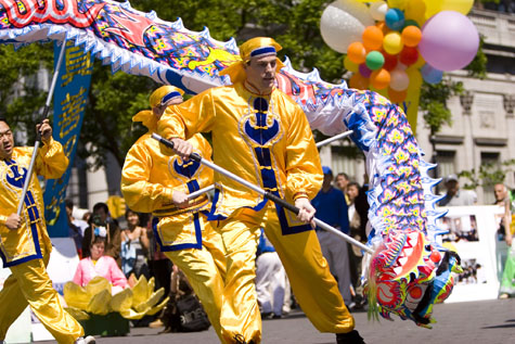 正如主持人介绍的“法轮功深深扎根于中华民族五千年文化,那是一个半神半人的文化”,舞蹈“仙笛”、“扇舞”等表现了中华民族对神的追寻和民间活泼善良的民俗文化。腰鼓队英姿勃发,让人耳目一新。中华民族传统的龙狮舞非常精彩,博得了阵阵掌声。