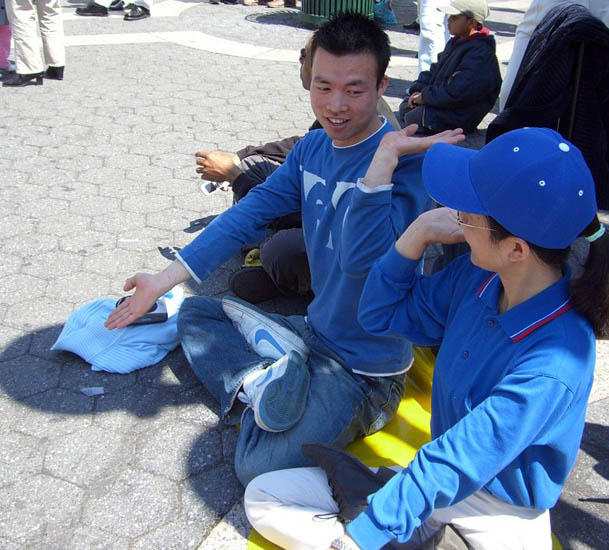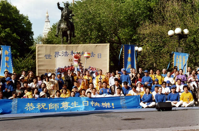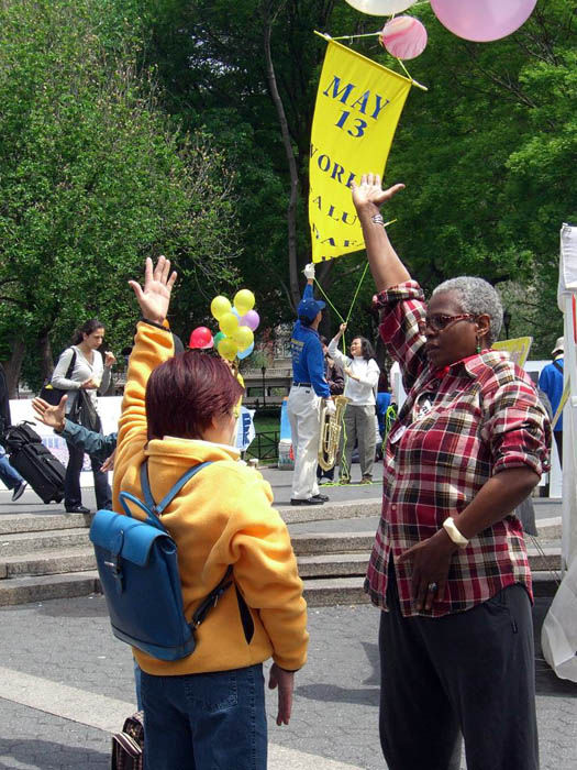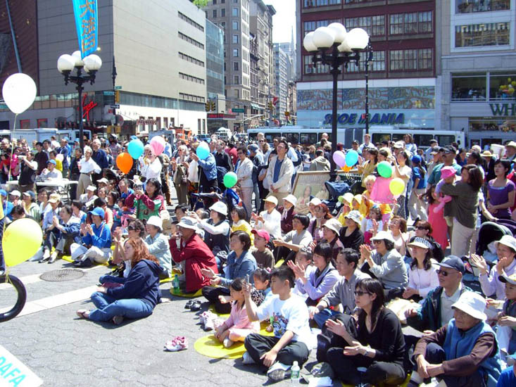 10点起,曼哈顿中心的联合广场上五彩气球带起数个中英文蓝底金字的大竖幅:“5.13日,世界法轮大法日”、“法轮大法好”、“真善忍”;广场上、草坪上,星星点点法轮功学员正在炼功;星星点点还有几个法轮功学员正在教功。台阶上,透明的纱质大屏风上中英文金字“5.13日,世界法轮大法日”,下镶大朵莲花花边,配以柔软的地毯,搭起了一个清新轻盈的舞台。