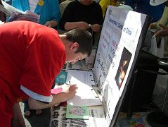 联合广场是曼哈顿最繁忙的地段之一,车水马龙,人流如潮,市民们兴致勃勃的和大法弟子们一起庆祝第7届世界法轮大法日。