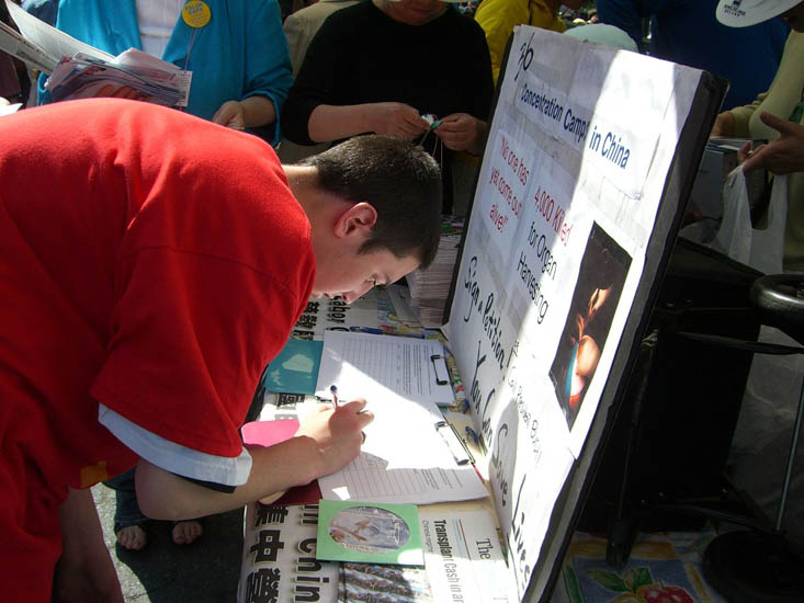人们从四面八方走来,看法轮大法图片展,学习功法,到信息桌前和学员聊天、拿资料,了解法轮功,签名反对迫害。一波一波的市民欢喜的欣赏着法轮功学员的精彩表演,聆听着主持者的对法轮功的介绍以并谴责中共当局对善良修炼人的残酷迫害。整个场面慈悲而祥和。