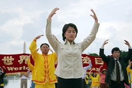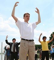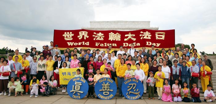 【明慧网2006年5月15日】五月十三日,部份华府大法弟子在象征着自由与人权的林肯纪念堂前以集体炼功与图片展的方式庆祝世界法轮大法日,恭贺慈悲伟大的师父生日快乐,同时向人们展现大法的美好与真相。优美的炼功音乐和祥和的能量场吸引了许多东西方游人的注目,许多人拿起手中的相机摄下这特殊的景致。