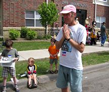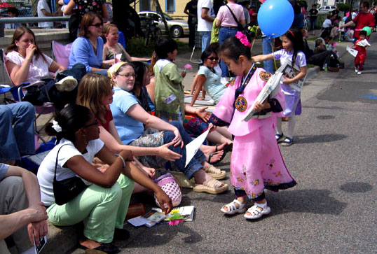 游行结束后,观众和参加游行的人群涌向湖边。在那里,学员设立了真相展位。有的学员演示功法;有的发资料;而有的给观众讲述法轮功的真相。很多小朋友在大莲花前拍照。