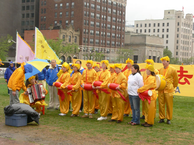 来自蒙特利尔的腰鼓队進行了腰鼓表演、两地学员表演了小合唱、诗朗诵、功法演示,渥太华小弟子表演了小号独奏。法轮功真相图片展吸引了大量游客。