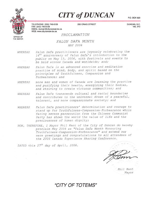 鉴此,我,邓肯市(City of Duncan)市长费尔·肯特(Phil Kent),特此宣布2006年5月为