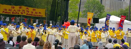 一个由多伦多法轮功学员组成的百人军乐团--天国乐团,首次与公众见面,并为观众演奏了“法轮大法好”和“法正乾坤”两首曲目,赢得观众热烈的掌声。