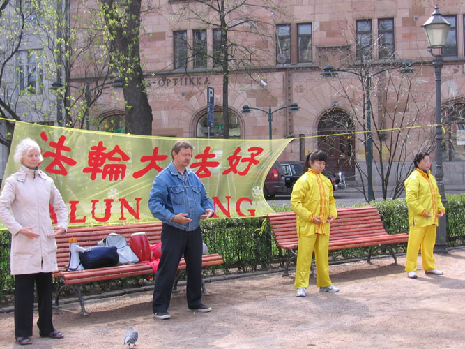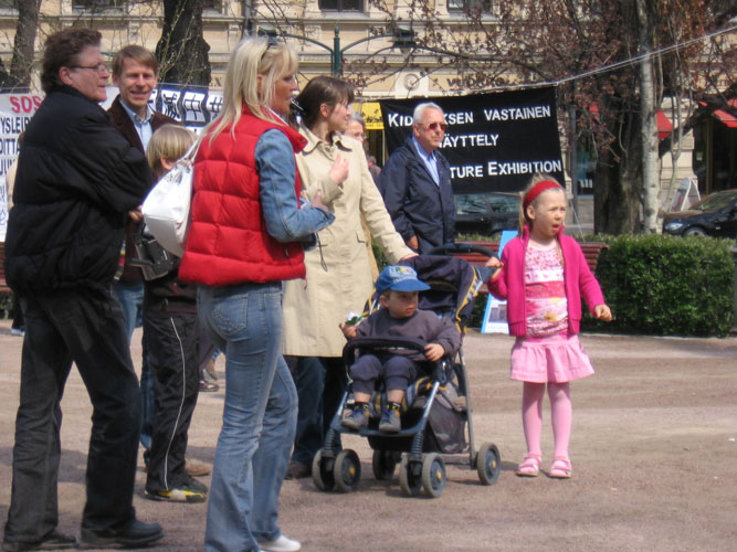 今天也是芬兰法轮功学员的腰鼓队第一次亮相,鼓队中有十几岁的少年,也有六十多岁的老者,亮丽的黄色炼功服和响亮的鼓声吸引游人纷纷驻足。不少人还用照象机和摄像机拍下了这美好的场面。
