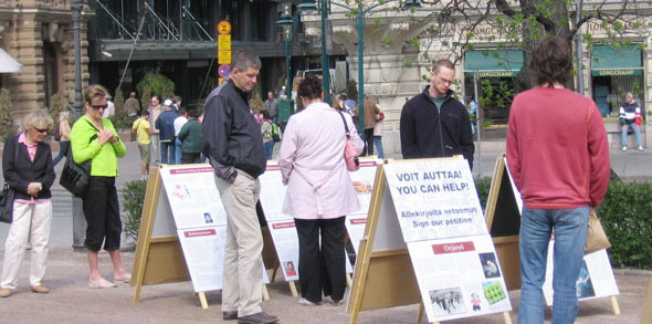 在给芬兰民众展示法轮大法美好的同时,学员们在另一侧悬挂着“天灭中共 退党自救 退党人数突破1000万”和“强烈谴责中共活体摘取法轮功学员器官盗卖、焚尸灭迹” 的横幅及真相展板,向人们揭露中共政权七年来迫害法轮功的罪行。许多民众认真阅读展板,纷纷签名声援反迫害。