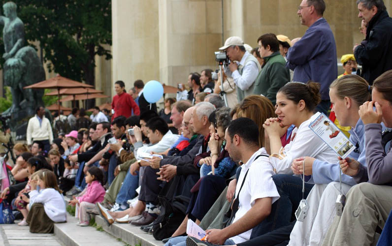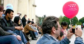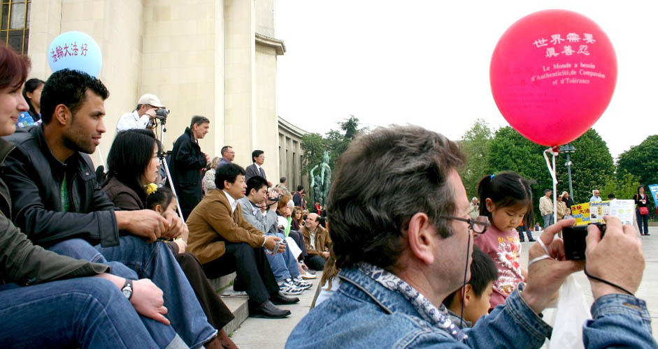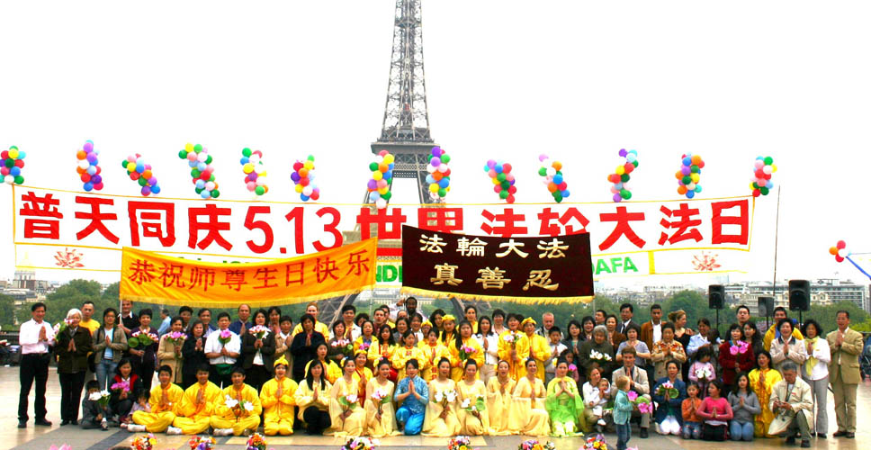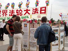 法轮功学员制作的巨大横幅“普天同庆世界法轮大法日”,每个字长、宽均为一米,下配有法文和两朵美丽盛开的莲花,从很远处就吸引到游人的目光。印有法轮大法好的彩色氢气球悬吊起横幅,缤纷的色彩让人赏心悦目。