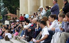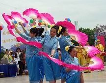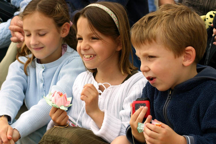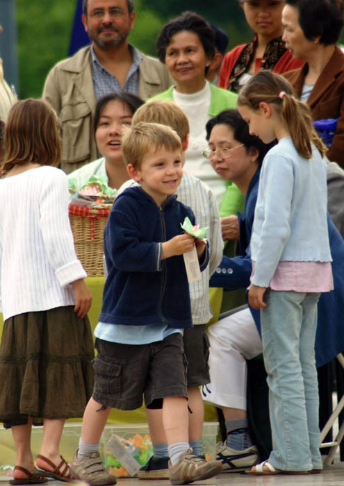 许多小孩子开心的跑来索要纸莲花,有的还在一边认真观看学叠纸莲花。广场上随处可见小孩子们手拿印有“法轮大法好”的氢气球,他们开心的笑容就象一朵朵盛开的莲花。