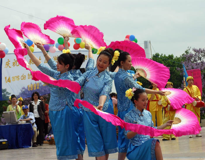 莲花象征着圣洁美好,出淤泥而不染,在莲花与花篮装点的场地上,大法弟子身穿黄衣,身背红色腰鼓,鼓声阵阵,敲出大法弟子的神威,赢得在场观众的阵阵掌声。法轮功学员组成的舞蹈队献上四个舞蹈“天女散花”、“莲花颂”、“扇子舞”与“思故国”,舞姿优美流畅,展现中国传统文化的同时,更把法轮大法的美好撒向人间。