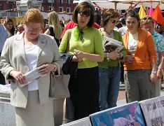 一边是祥和优美的功法演示,另一边是惨烈的迫害,这强烈的反差立即引来了人们的关注,很多人索要真相报纸和VCD,也有一些急于参加节日盛会的人,接过资料后,边走边读,当读明白时,特意返回来签字支持法轮功;有的人当场学习五套功法。