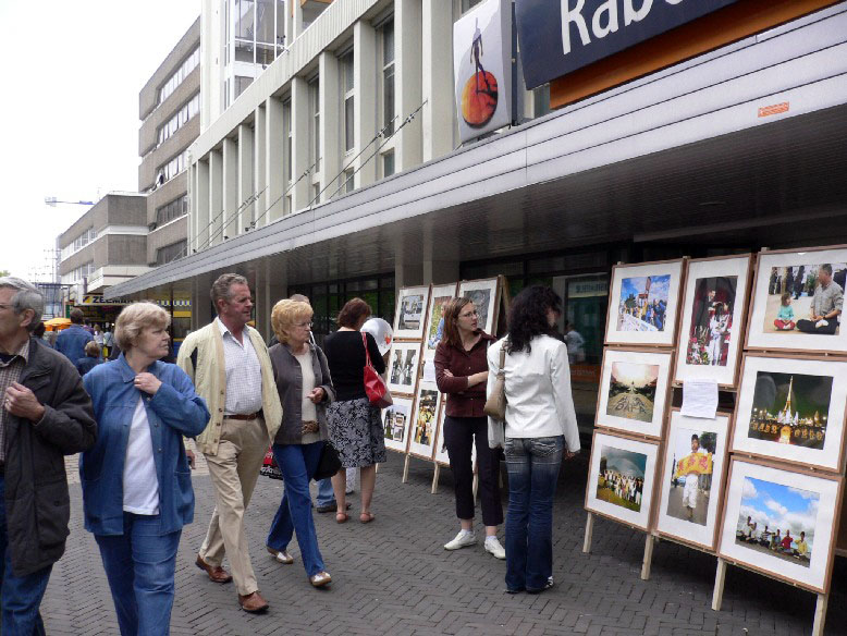 法轮大法洪传世界十四周年,很多珍贵的历史时刻通过照片记录了下来,由此制作的32幅照片在河林街头展出,让人们了解大法的美好殊胜。
