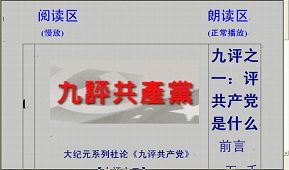 金然朗读的九评可在放光明下载,登陆放光明后,点击左栏的“九评影音”,金然朗读的九评之一约二十七分钟,下载后,把九评之一的MPG文件片头切掉,约4MB,片尾切掉约7MB,是否准确,可以试听一下开头和结尾,开头和前面捕捉的起点相同,结尾应和九评之一最后的几个字相同或滞后一点。为什么要切掉片头、片尾呢?如果不切掉,在慢放时停留很长的时间,会被人误以为光盘有问题。