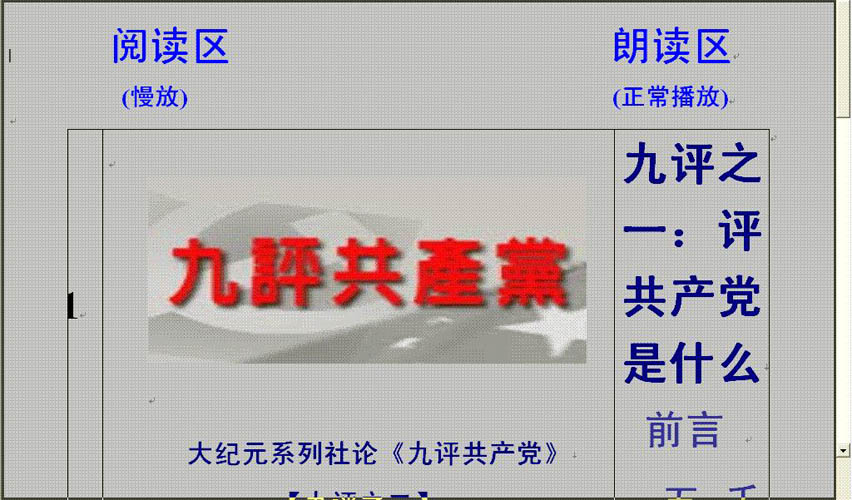 【明慧网2006年5月18日】九评VCD文字光盘的制作,经过了一个探索的过程,《轻松制作一张碟装九评全部内容》(明慧网2005年12月12日)一文主要解决一个问题,使文字和声音同步,把九评文字光盘变成有声读物,《一碟多用的VCD文字光盘》(明慧网2006年3月28日)主要解决播放的问题,同时对原来的模板重新進行设置,由于采用慢放的方式,同时背景和字体的搭配比较合理,可读性比较强,同修反映比较好,后来又发现另一个问题,由于翻页捕捉文字时用力不均匀或其它的原因导致个别页面的移动不均匀,以致个别页面有一二行无法阅读,虽然数量不多,但感觉总不好,为了解决这个问题,重新设计了一个模板,如图一、图二所示。