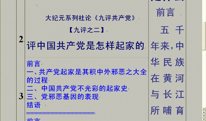 文字在电视机中阅读会有闪烁的现象,而字体比较大就没有影响,所以新模板中的九评之二至九的正文由原来的二号字改为一号字,采用新模板后,捕捉时应把光标移到左边数字栏的底部,如图二中的光标应停留在3的旁边,然后按键盘的下拉箭头(或PageDown键)移动页面,3跳到2的位置,4出现在屏幕的底部,用这种方法移动页面,每一次移动的距离都是确定的,而且也便于阅读,每一次都是从屏幕中间的数字右边接着阅读。