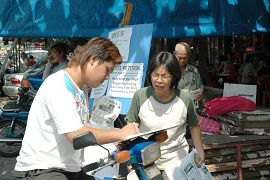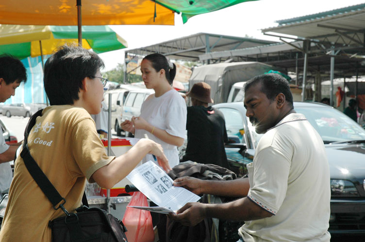 在第一次派发资料当中,学员巧遇来到马来西亚工作的中国人。他们很惊讶的看到学员在人潮众多的早市为蒙难的中国法轮功学员征集签名。由于在中国很难得到真相资料,因此,他们跟法轮功学员要了许多资料,其中包括《九评共产党》,让其他朋友一起看。