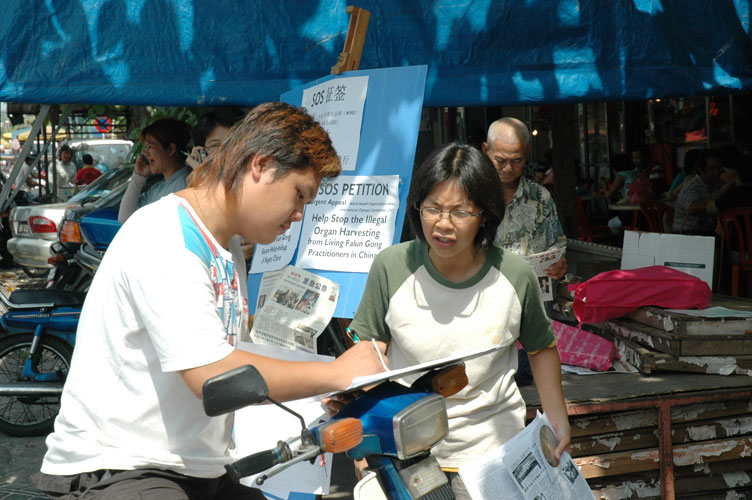 当学员第二次来到新村派发传单和征集签名时,那里的中国人很高兴的看到学员再次的到来。其中一位看了“九评”后想看一看《转法轮》。原来他们不了解什么是法轮功,也没有看过法轮功书籍,更不理解为什么中共要镇压法轮功。这次他要自己亲自去看法轮功书籍来了解法轮功。