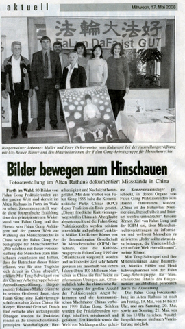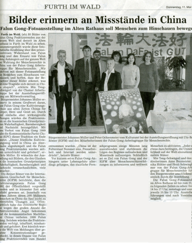图片展开幕后第二天,“拜恩森林回响报”(Bayerwald Echo)也刊登了报导,题为“福特市政府:为中国人权努力/ 法轮功图片展纪录残忍的虐待”。 报导中写到,福特市长尤汉纳斯·穆勒(Johannes Mueller)为法轮功图片展揭幕。法轮功人权工作小组希望通过图片让人们去观察(真相)。