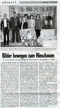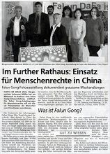 克茨廷(Koetzting)日报以“图片让人想到中国阴暗的一面/法轮功图片展触动人们去看一看”为题。报导中写,80幅来自全世界的法轮功学员的图片目前在福特市(Furth im Wald)市政府展出。图片表现的是法轮功的坚韧的精神和全世界的法轮功学员为维护中国的人权所付出的努力。