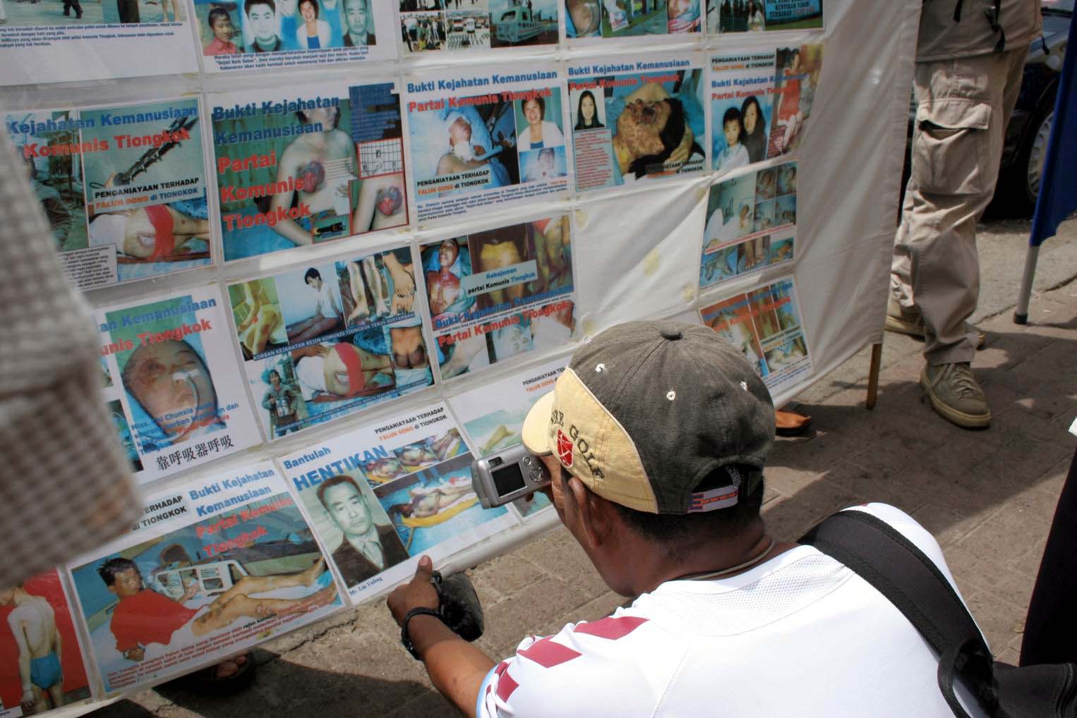 ![]() 揭露中共迫害法轮功的百种酷刑图片再现雅加达唐人街 | ![]() 民众围观中共以百种酷刑迫害法轮功的照片 |
