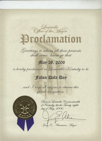 兹宣布2006年5月28日为肯塔基州路易丝维尔市“法轮大法日”,并敦请所有市民庆祝这一特殊的日子。