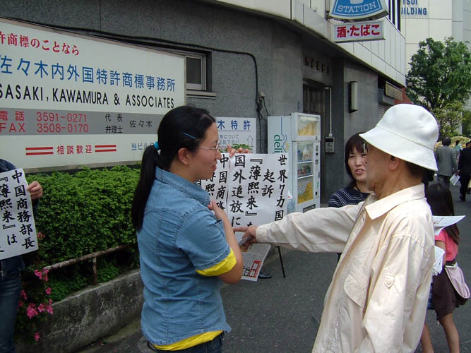 日本法轮大法学会的佐藤先生说,薄熙来到日本,结果让日本外务省、经济产业省等有关部门政府官员,让日本国会议员们,让日本的警察、普通老百姓等,都来很好的上了一堂了解其人并因此认识中共邪恶本质的课。日本法轮功学员从薄27日在大阪入境开始,就一直举办抗议活动。在其入住的京都御所内的迎宾馆、在其活动的东京中共大使馆、大仓饭店处、在与其来日相关的日本外务省、经济产业省等部门及国会前等多处打横幅、发真相资料,结果薄熙来进入中共大使馆走后面小门,在大仓饭店如临大敌,施压日本警方阻拦法轮功学员接近,种种此类,反而让日本政府和人民认识到其因为残酷迫害中国民众、在世界上到处被起诉而羞于见人。在薄担任辽宁省长期间,至少有103名法轮功学员被迫害致死,更有多名证人揭露位于辽宁省沈阳苏家屯的集中营自2001年起活体摘取法轮功学员的器官。我们曝光这样的杀人恶魔,是要制止迫害,同时也是希望日本政府和人民真正了解法轮功真相。
