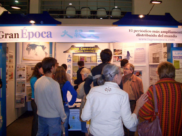 可是两年前由于中共大使馆企图赶走第一次参加书展的法轮功学员,并且威胁大会如不撤销法轮功摊位,它就退出。因为此无理的要求没有被大会接受,中共大使馆只有取消安排的文化研讨会,并且退出了大会。一个大会人员向大纪元透露,两年来中使馆每年施加压力,要大会禁止法轮功参展,并且说有法轮功,中国使馆就不参加。大会只有说,那中共使馆就不要参加好了,因为这是阿根廷,任何参加的摊位只要没有暴力的行动,是有言论自由的,而且大会的宗旨是拥护人权的。该大会人员继续祝贺大纪元的工作人员,说大纪元报纸做的太好了。