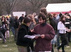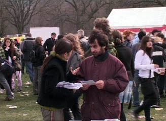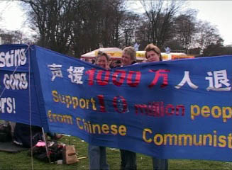 五月一日下午,上万人涌入公园。写有英文“制止活体摘除法轮功学员器官!”和中、英文“声援1000万人退出中共”的横幅标语在熙熙攘攘的人群里尤为瞩目,不断有群众过来了解,询问。