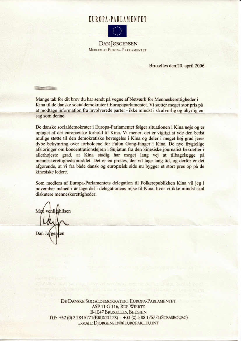 【明慧网2006年5月6日】2006年4月20日,丹麦非政府组织“中国人权网络”收到丹麦第二大党社会民主党欧盟议员丹•约恩森(Dan Joergensen)先生的来信,表示对最近被披露的中共活体摘取法轮功学员器官一事的极大焦虑。