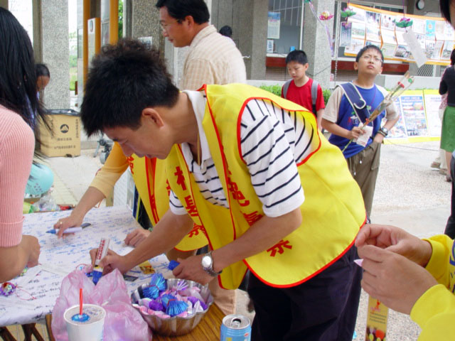 【明慧网2006年5月7日】二零零六年五月六日,台湾金门县社会局在金门县社会福利馆提前举办庆祝母亲节“百千风味•温馨五月情”园游会的活动。台湾金门县法轮功学员参与园游会摆摊,以莲花DIY、图片展示、影片播放、征签等方式,向更多的金门人讲述法轮功的故事。