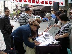 一位去过中国的法国女士表示,她对中共迫害法轮功早有了解,她对法轮功学员讲述了她去中领馆办理签证和在中国的经历:“我知道这件事是因为我去中领馆办旅游签证,在中领馆前也遇到过你们这样的活动,我拿了一些资料,当我进到中领馆时,看门的人要求我扔掉这些关于法轮功的资料和报纸,我拒绝了。我说:‘我还没有看,你们不可以强迫要求我什么!这里不是中国!’他们非常的愤怒。15天后我去取我的签证,然后去了中国,停留了10天左右。然而我的行李被刀割破,不知道是不是由于我看过法轮功报纸而被他们(中共)注意,但也可能是巧合。在中国,我非常不欣赏那些中国人所做的事情,就我所知,天安门广场有很多士兵不停的监视着游客。我知道一位来自斯堪的纳维亚的女士和他们整个旅行团被带到警察局一个晚上,他们所有的胶片都被从照相机中取出。警察检查了他们所有的照片但未说明任何原因。我猜测这些警察认为其中有关于法轮功学员的照片。由此,我意识到了所发生的这一切,但关于摘取器官,我还不知道。这太恐怖了。在我们这个时代,他们(中共)还在对人实行酷刑,这太残酷了。我觉得你们很有勇气,你们做的这些非常好,必须让人们知道这些。”